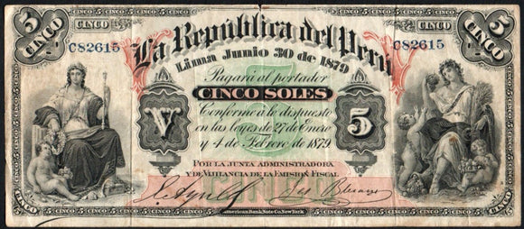 Peru 5 Soles 1879 With "V" overprint, P-3 AA110