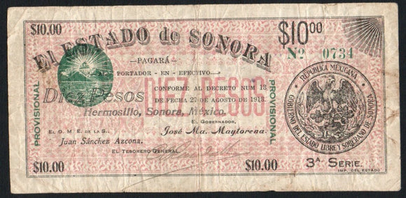 Mexico 10 Pesos 1913 Estado de SONORA M-3817f, ME021
