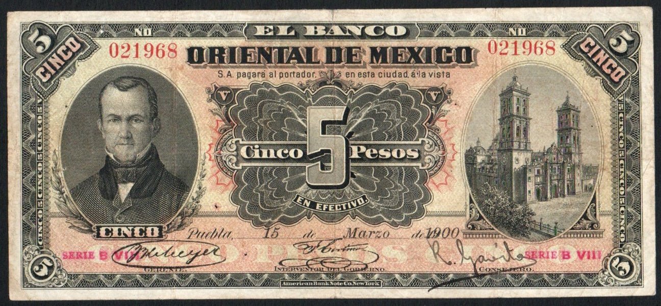 Mexico 5 Pesos 1900 El Banco Oriental M-460a /968